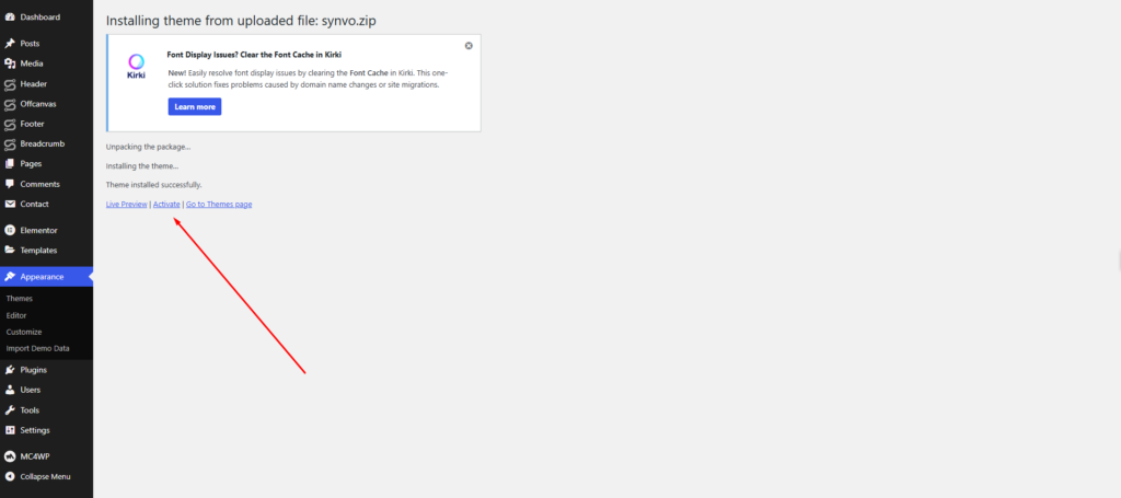 Once uploaded, activate the theme by heading to the “Themes” menu in the WordPress Dashboard. Locate the Synvo theme and hit “Activate”.