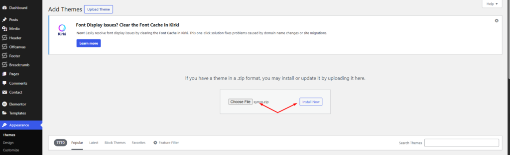 Note: When uploading your theme with the installer, please ensure you are uploading the theme .zip file, not the entire package you downloaded. In this case, you will be uploading synvo.zip.